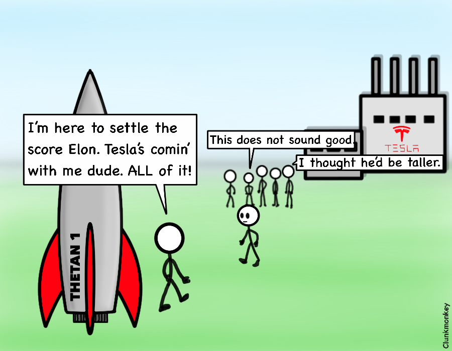 Imagine an alien spacecraft suddenly appeared… say a Thetan ship captained by Tom Cruise. Let’s say Captain Toms ex-wife went out with Elon once or twice – a clear violation of the bro code – so Cap’n Tom’s here to settle the score.